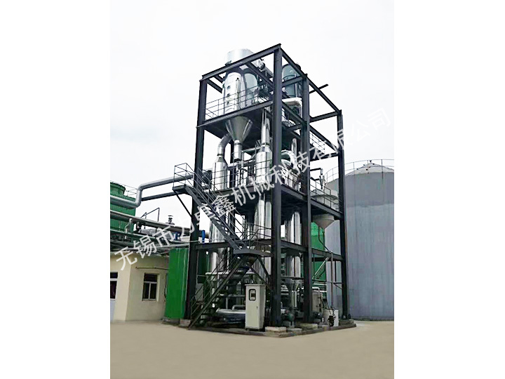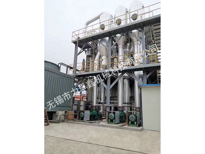 工作原理:四效降膜蒸發(fā)器需濃縮的料液由泵送入加熱管頂部,沿著加熱管內(nèi)壁形成液膜向下流動。在這個過程中,由于管外的加熱,管內(nèi)液膜開始沸騰并部分蒸發(fā)